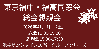 2025年6月10日2025年6月10日 広報 総会・懇親会報告 4月12日に「令和7年度 東京福中・福高同窓会 総会・懇親会」が開催されました。当番幹事は2の回の皆様、参加者は246名。そのうち、60~71回生は11名、72回生以降19名でした。テーマは「SAI~彩・再・祭~」。企画は福中・福高に関連するワードを使用したビンゴ大会「福中・福高クイズdeビンゴ!」でした。ご来場の皆様、当番幹事の皆様、誠にありがとうございました。 1 2 ►